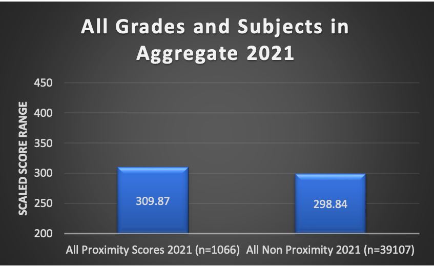 - In 2021, across all grades and subjects, Proximity scores were 11 points higher than non-Proximity scores. This puts Proximity students at a Level 2 according to TAS.